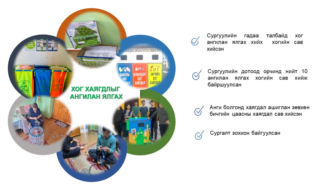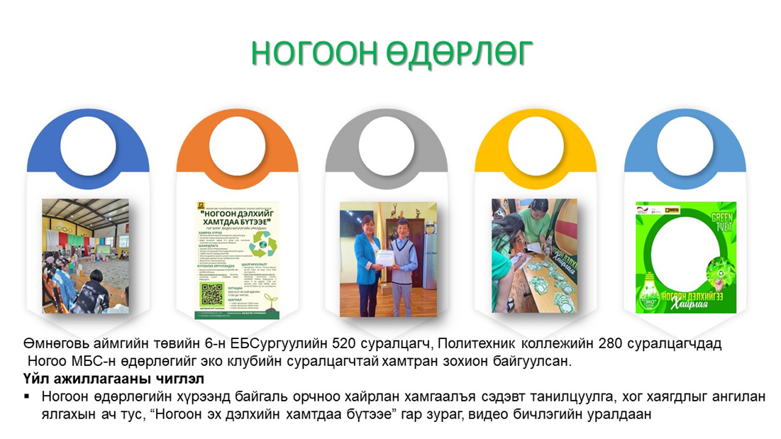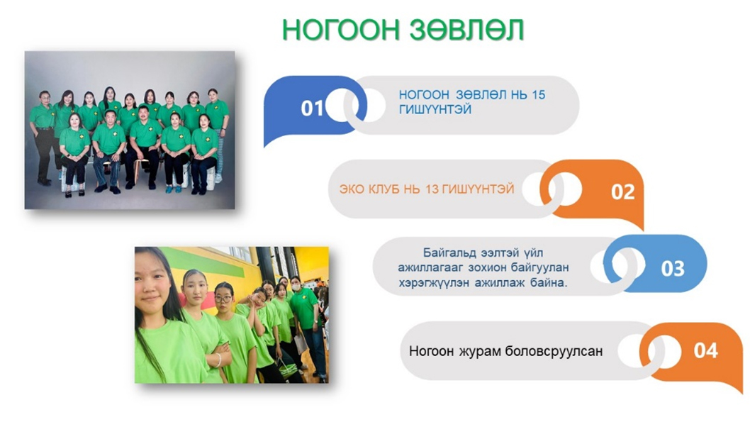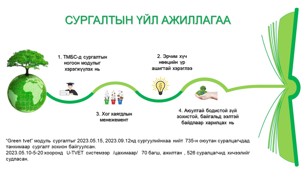 - ТМБС-н сургалтын ногоон модулийг хэрэгжүүлэх, эрчим хүчний нөөцийг үр ашигтай хэрэглээний талаар мэдлэг, зөв хандлагыг уриаллаа. Сургалтад нийт 1-р ангийн 120 суралцагч хамрагдлаа.