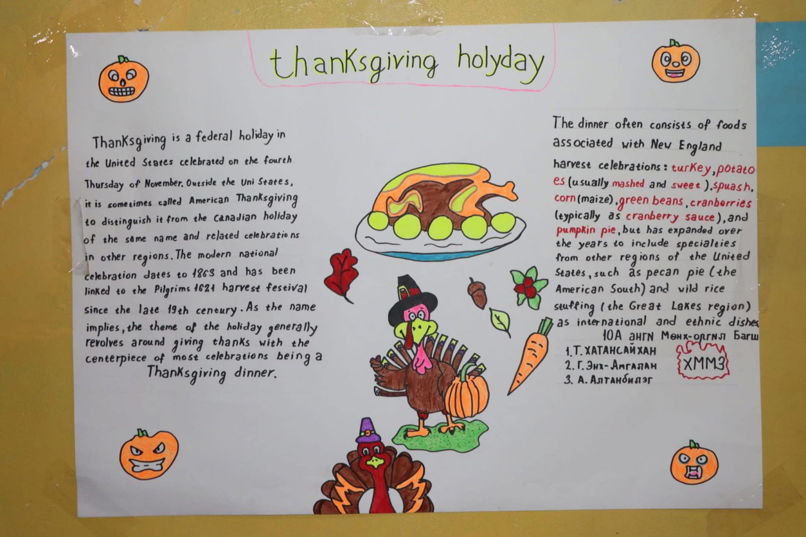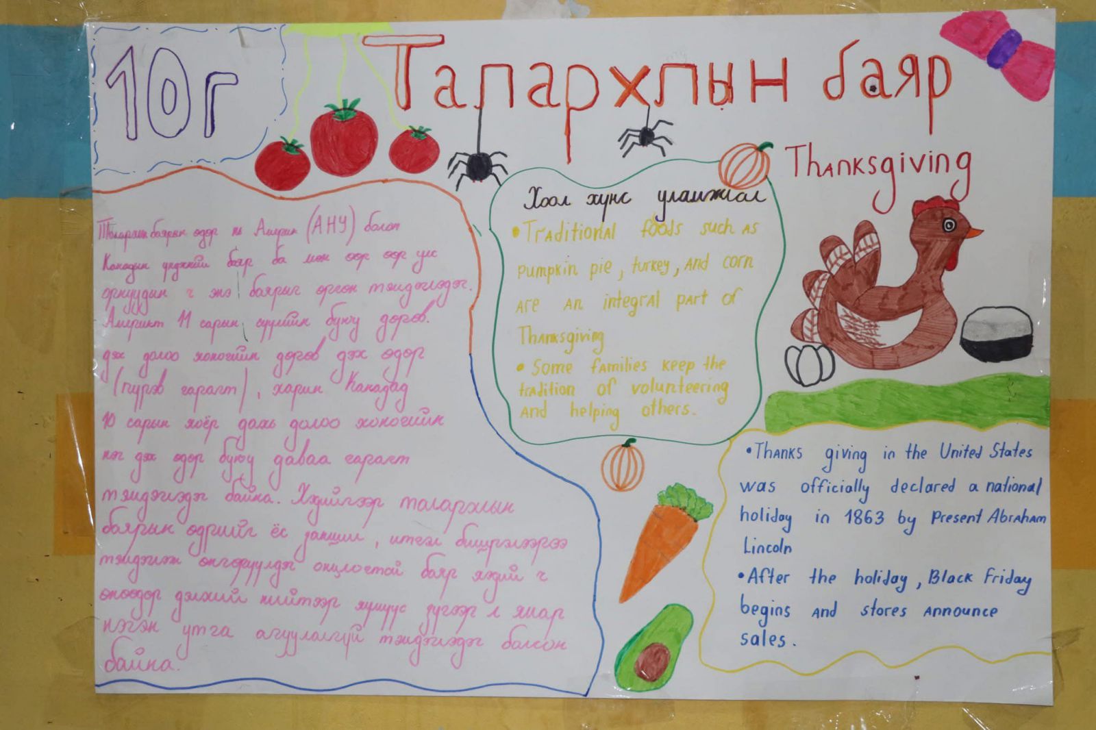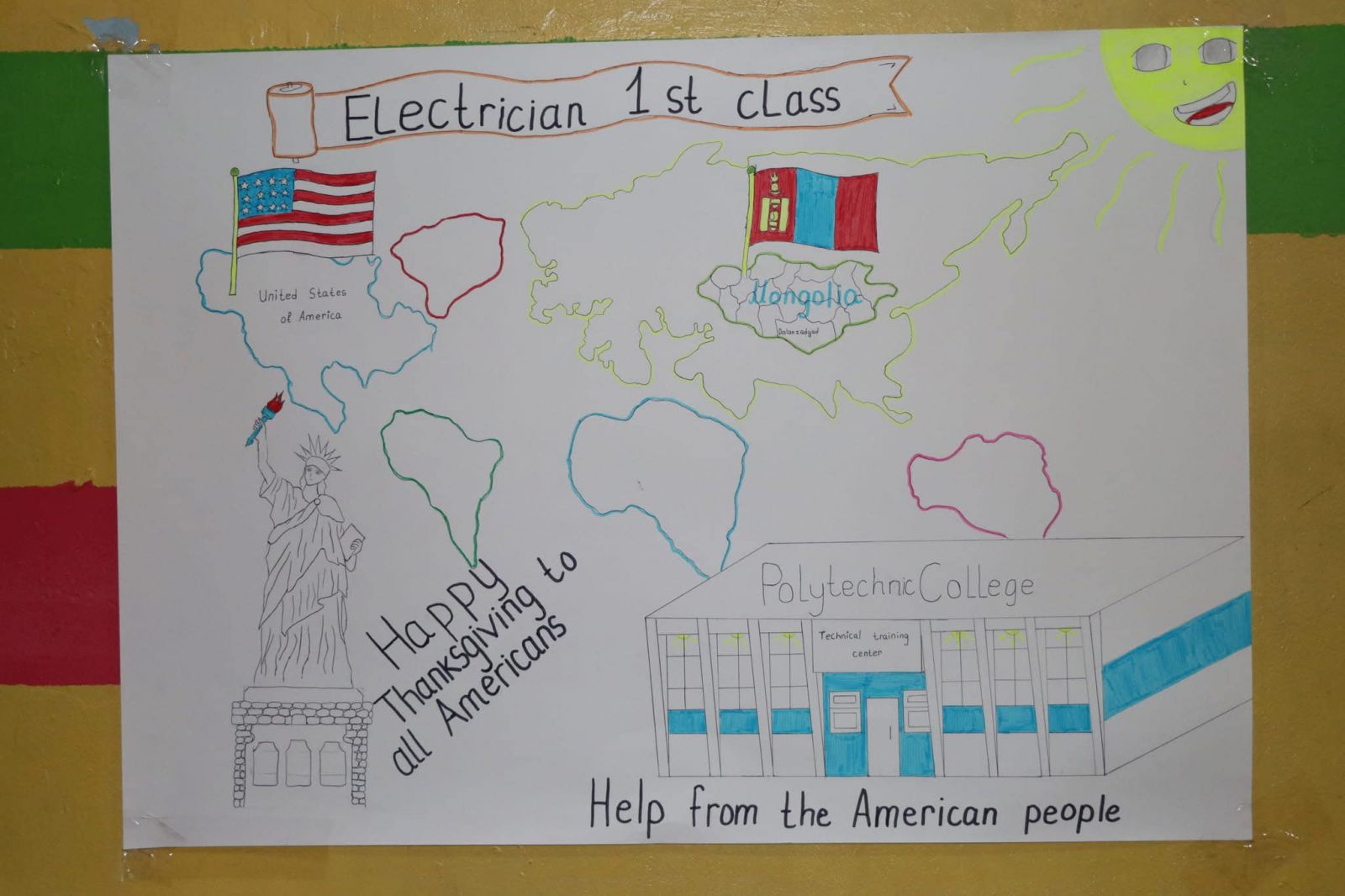 ШУТИС-ын Өмнөговь аймаг дахь Технологийн дээд сургуулийн харьяа Политехник коллежид АНУ-Фулбрайтын Англи хэлний туслах багш хөтөлбөрийн хүрээнд ажиллаж буй багш Kavenik Nathanael , Англи хэлний багш нартай хамтран "Happy thanksgiving" баярыг 1-р ангийн сурагчидтай хамтран зохион байгууллаа.